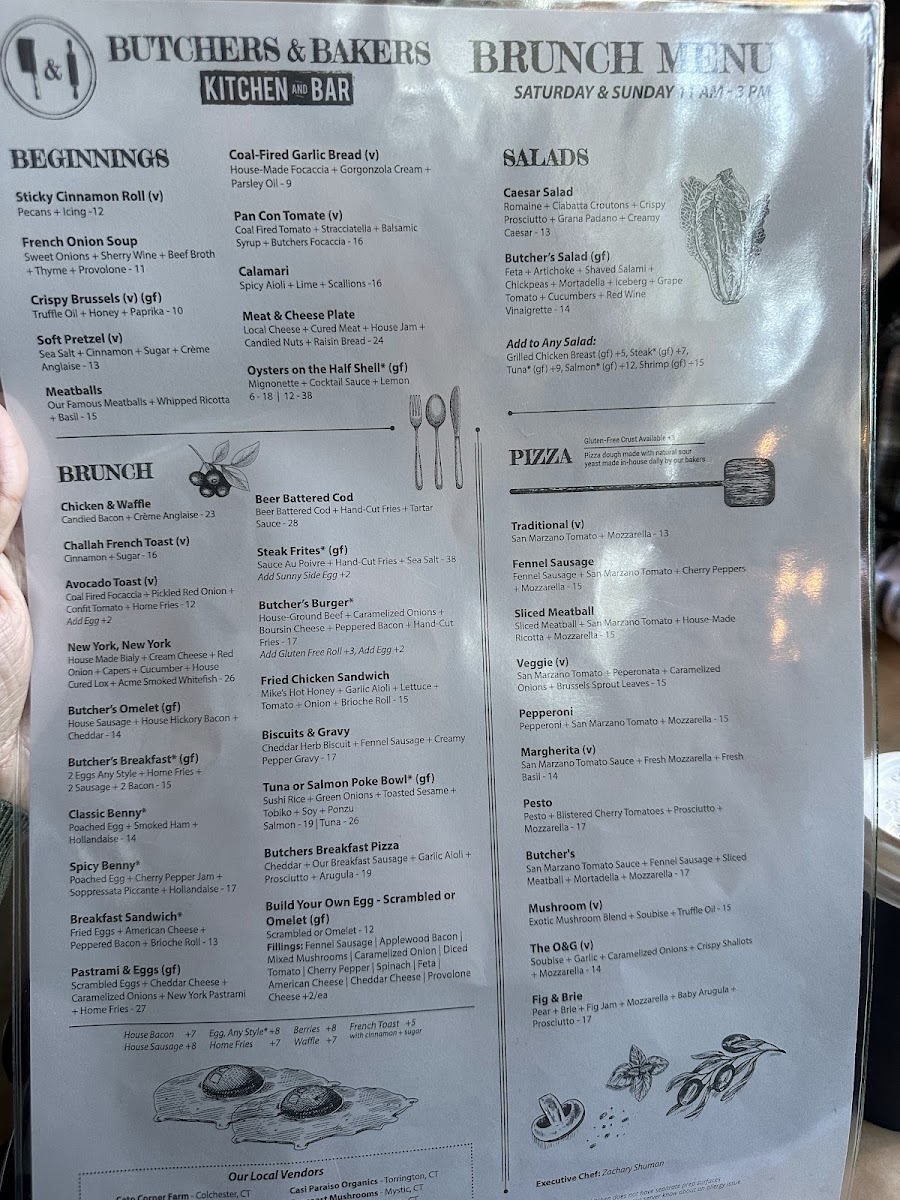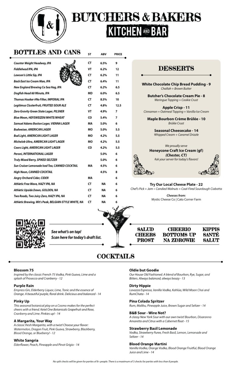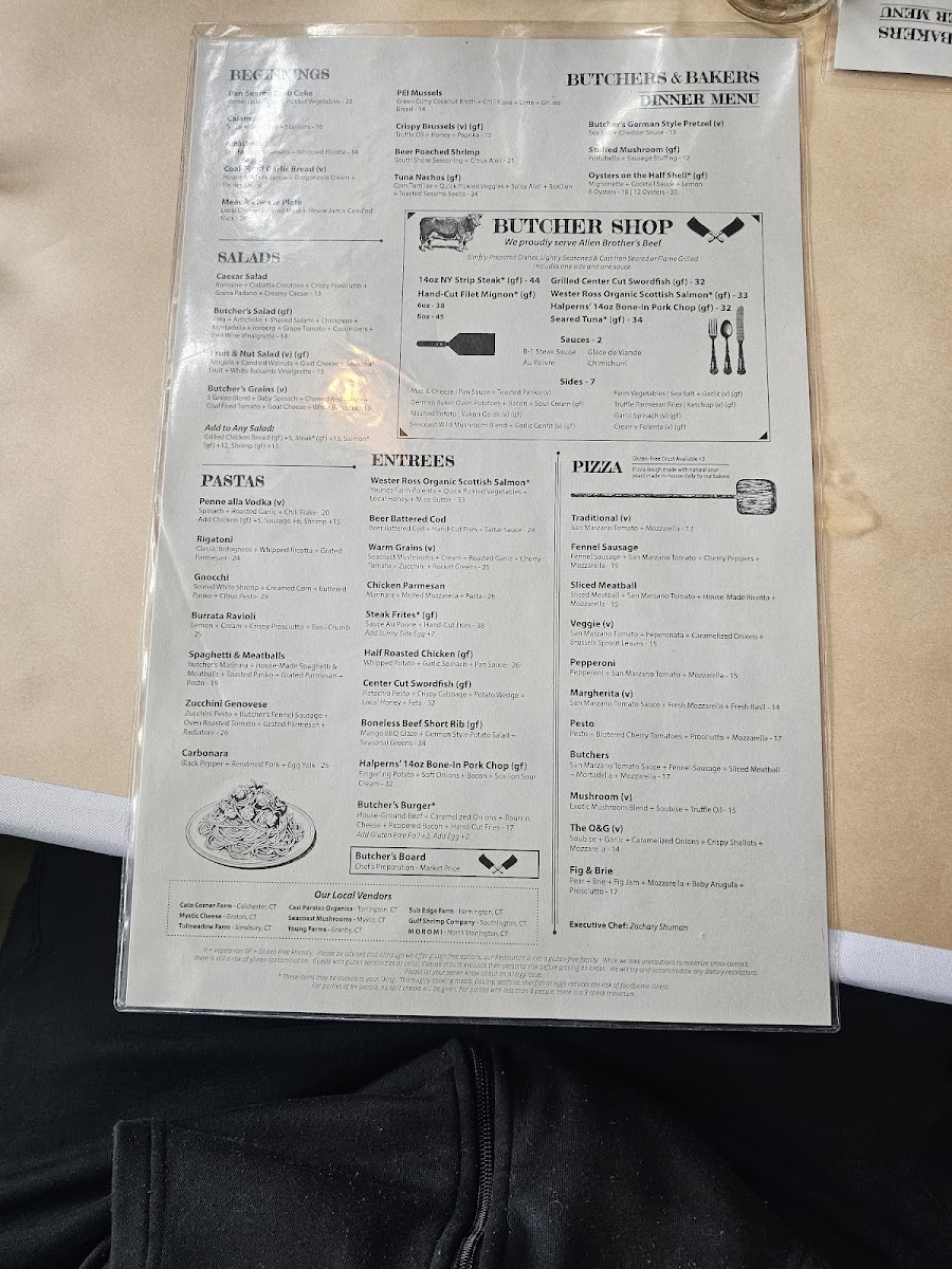 Butchers & Bakers in Farmington, CT offers a refined take on American cuisine that blends hearty flavors with fresh, thoughtfully crafted ingredients. The menu shines with its vibrant salads, like the Caesar Salad featuring crispy romaine, prosciutto, and creamy dressing, and the robust Butcher’s Salad loaded with salami, mortadella, and feta. Their sides complement mains beautifully, from luscious truffle fries and creamy mac and cheese to seasonal farm veggies and rich Yukon mashed potatoes.